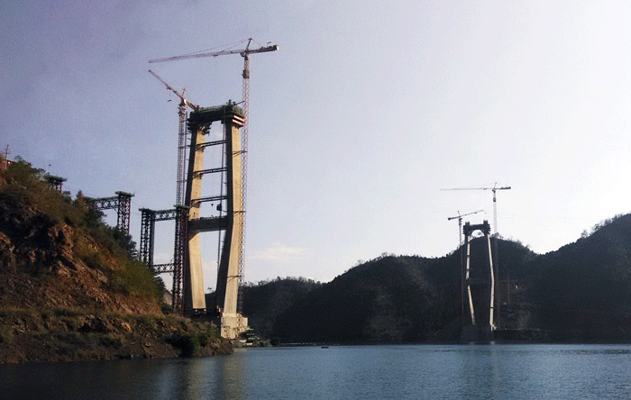 项目地点:贵州红水河特大桥两侧桥墩高度均为210米,每个桥墩的起重机械配置均为LY.COM-乐鱼(中国)生产的一台C7036塔机、一台C7030塔机和两台SC200/200WPZ中速变频施工梯,副墩的施工机械为一台P125平头式塔机。